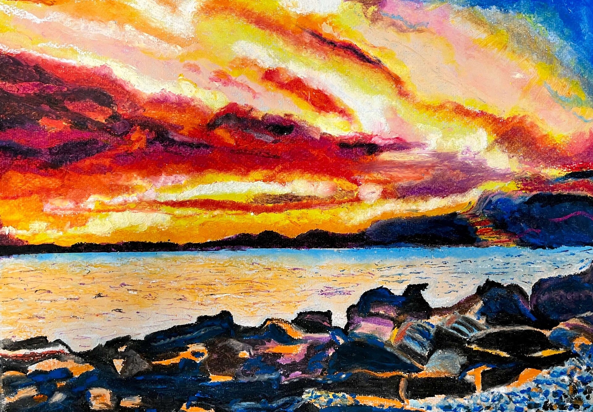 Lost in a world of vibrant hues and bold strokes we tackled a semi-abstract seascape using oil pastels.. from vivid blue to fiery orange, and plenty of pink and yellow in between, the sea and sky has never looked so dynamic!