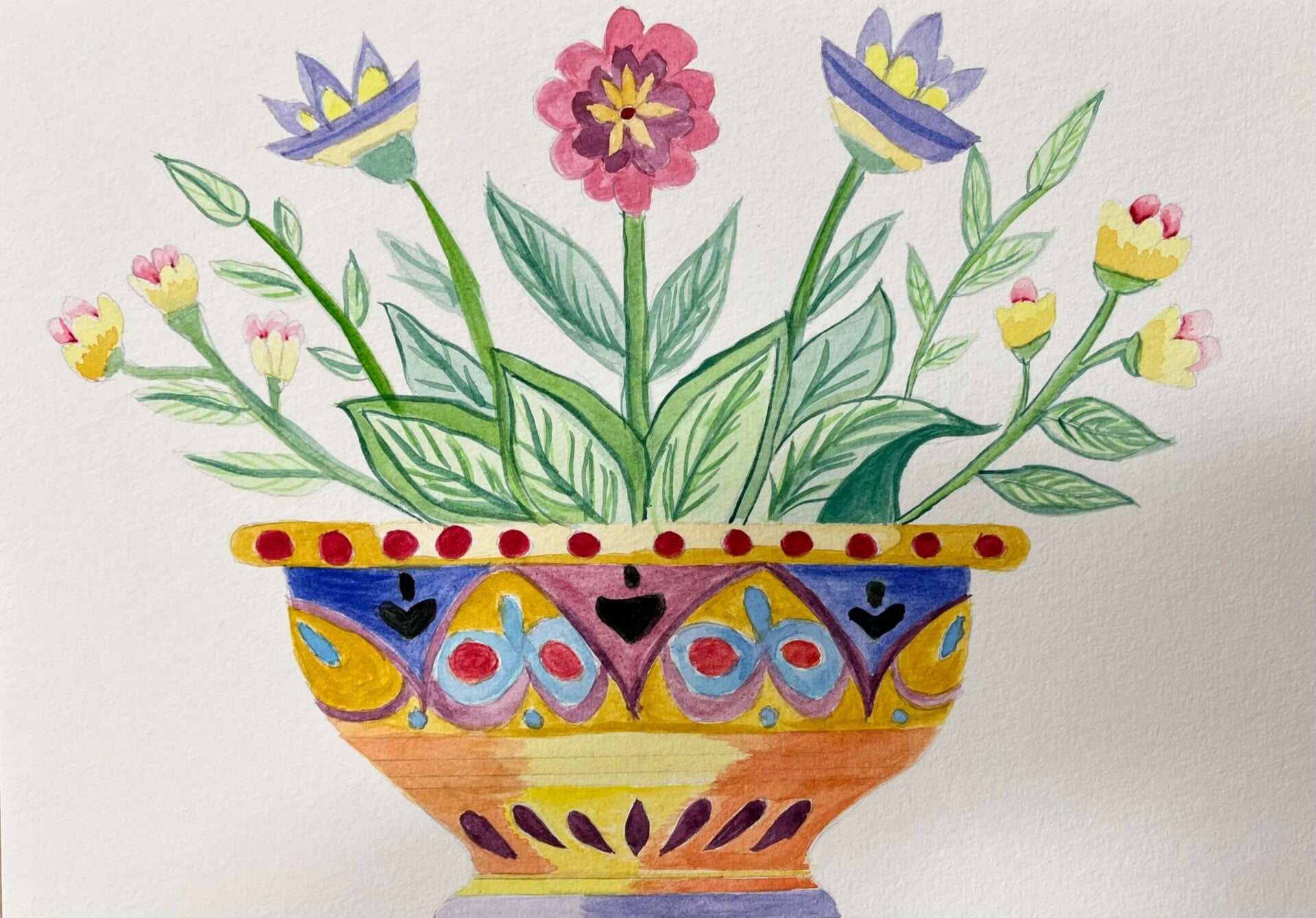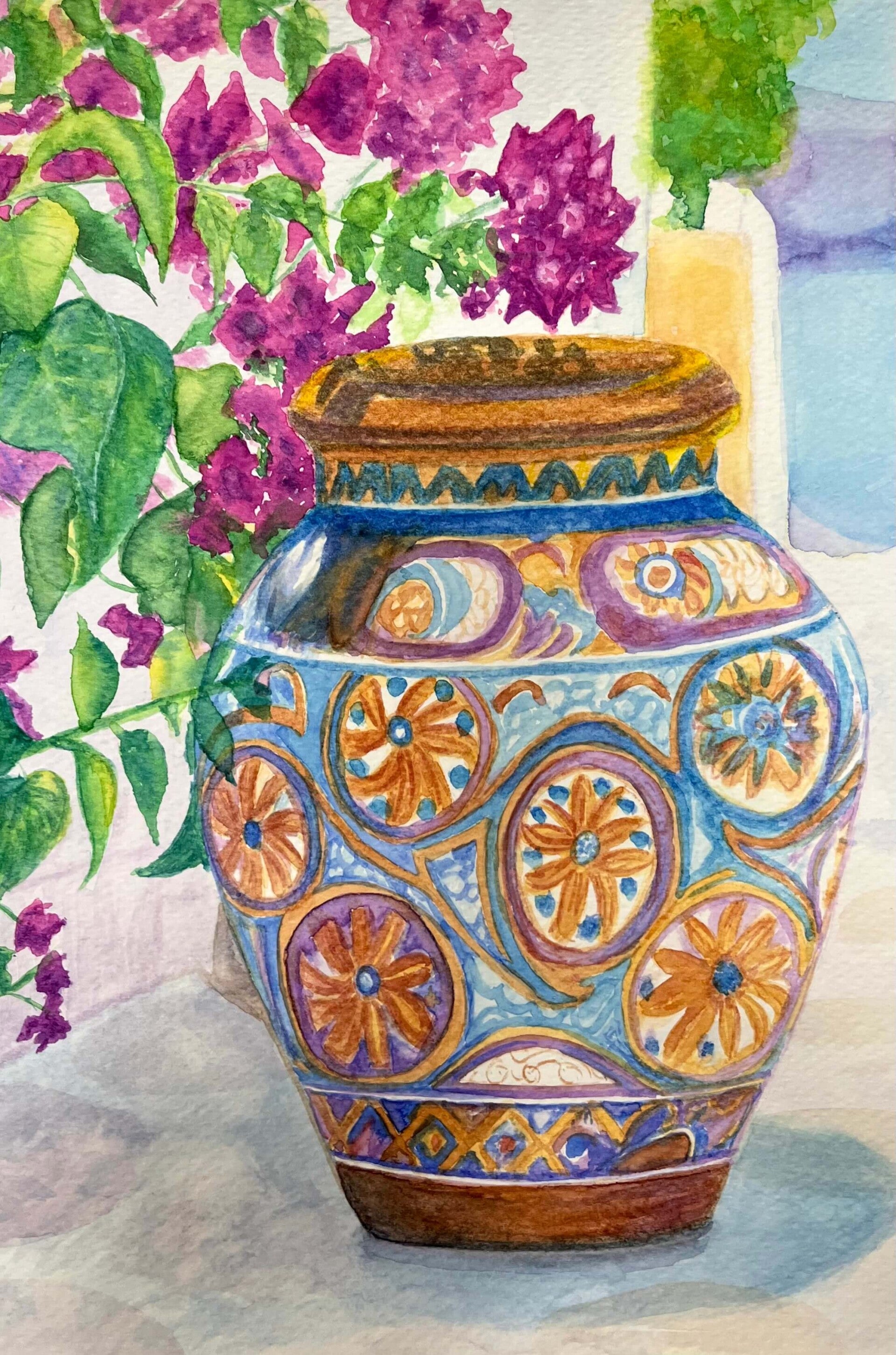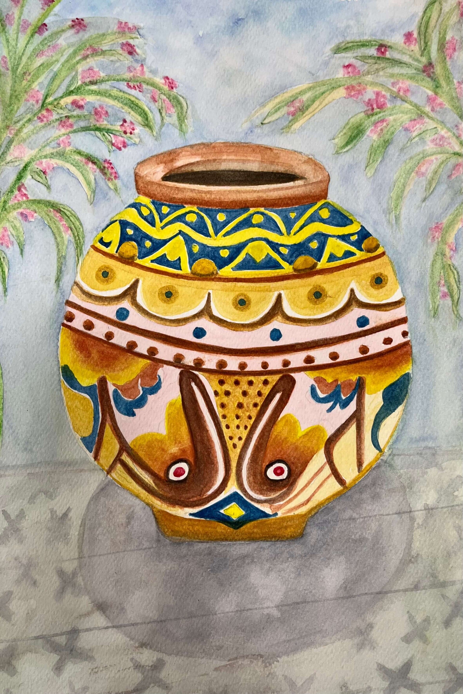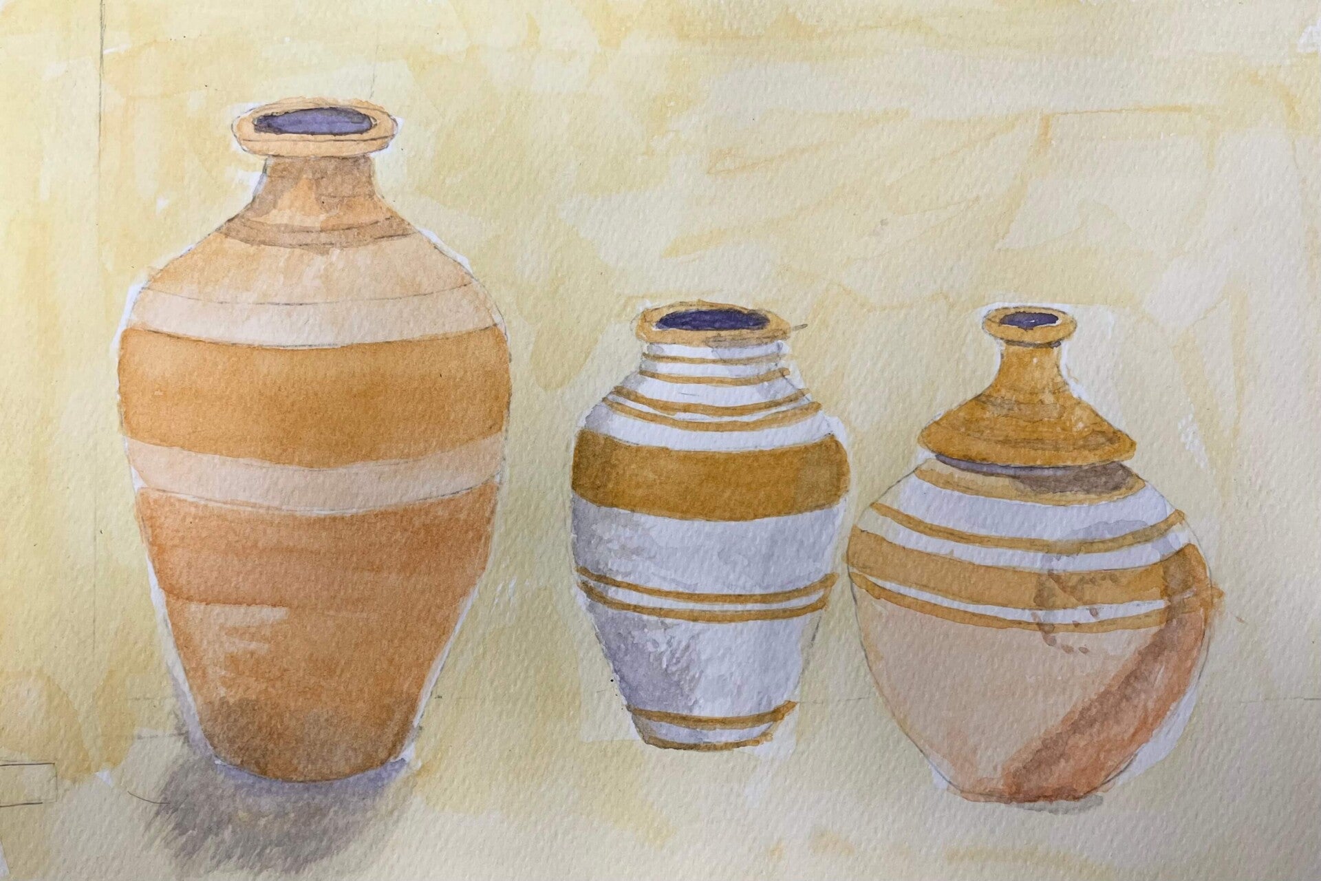 This week we are painting with both watercolour and gouache. Some opted for the transparent, fluid nature of watercolours, whereas others preferred the bolder, more opaque finish of gouache. From traditional terracotta to vibrant colours and intricate designs we have a beautiful collection of Mediterranean pottery.