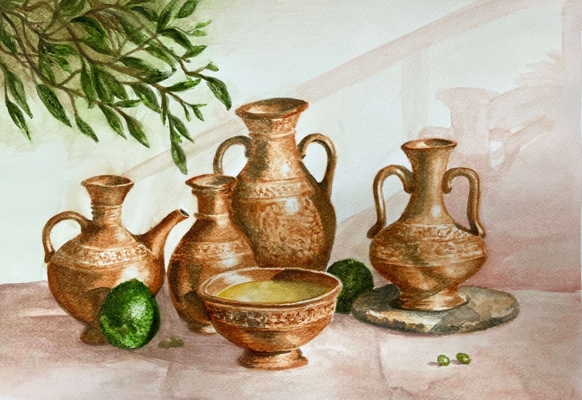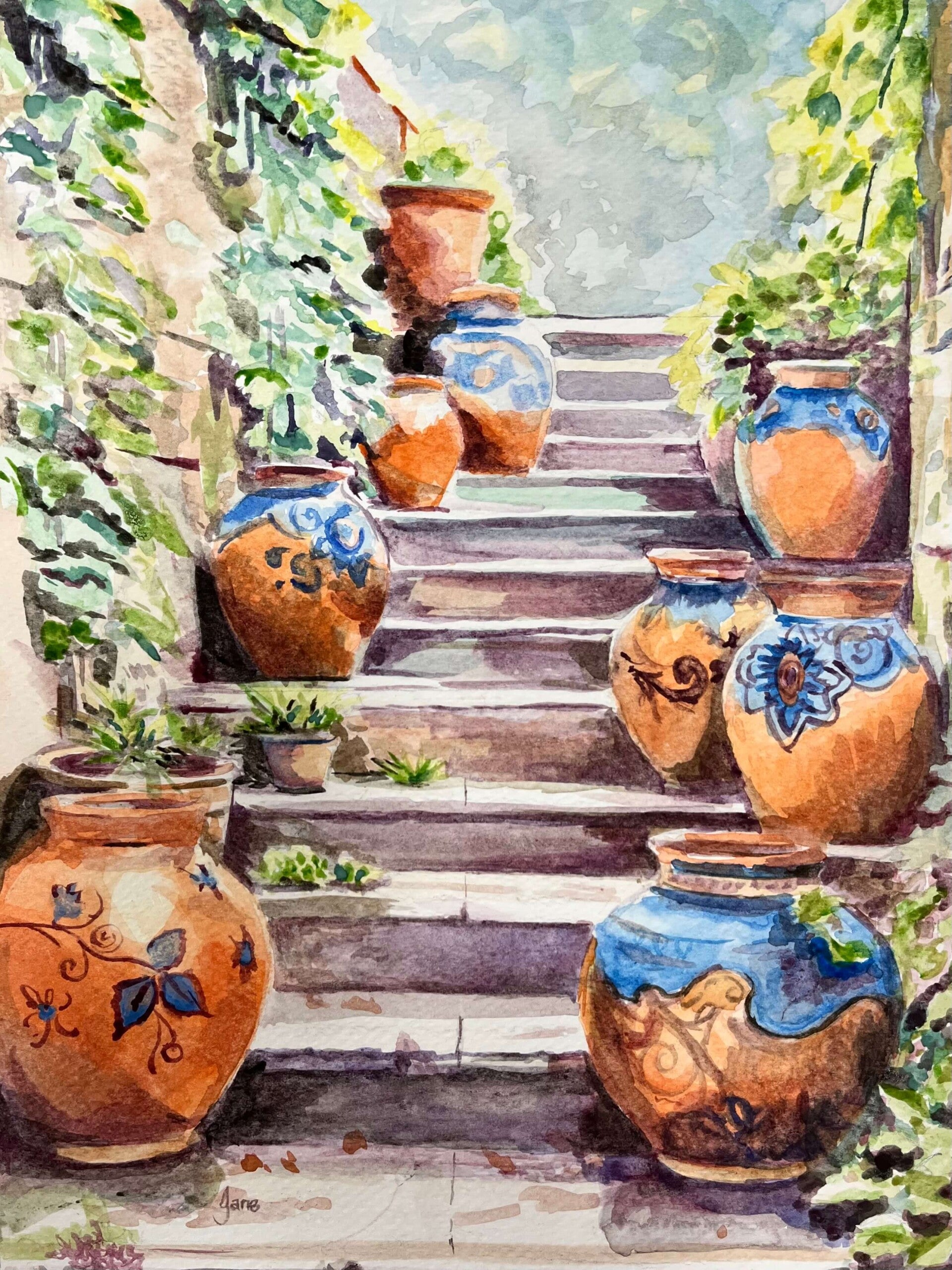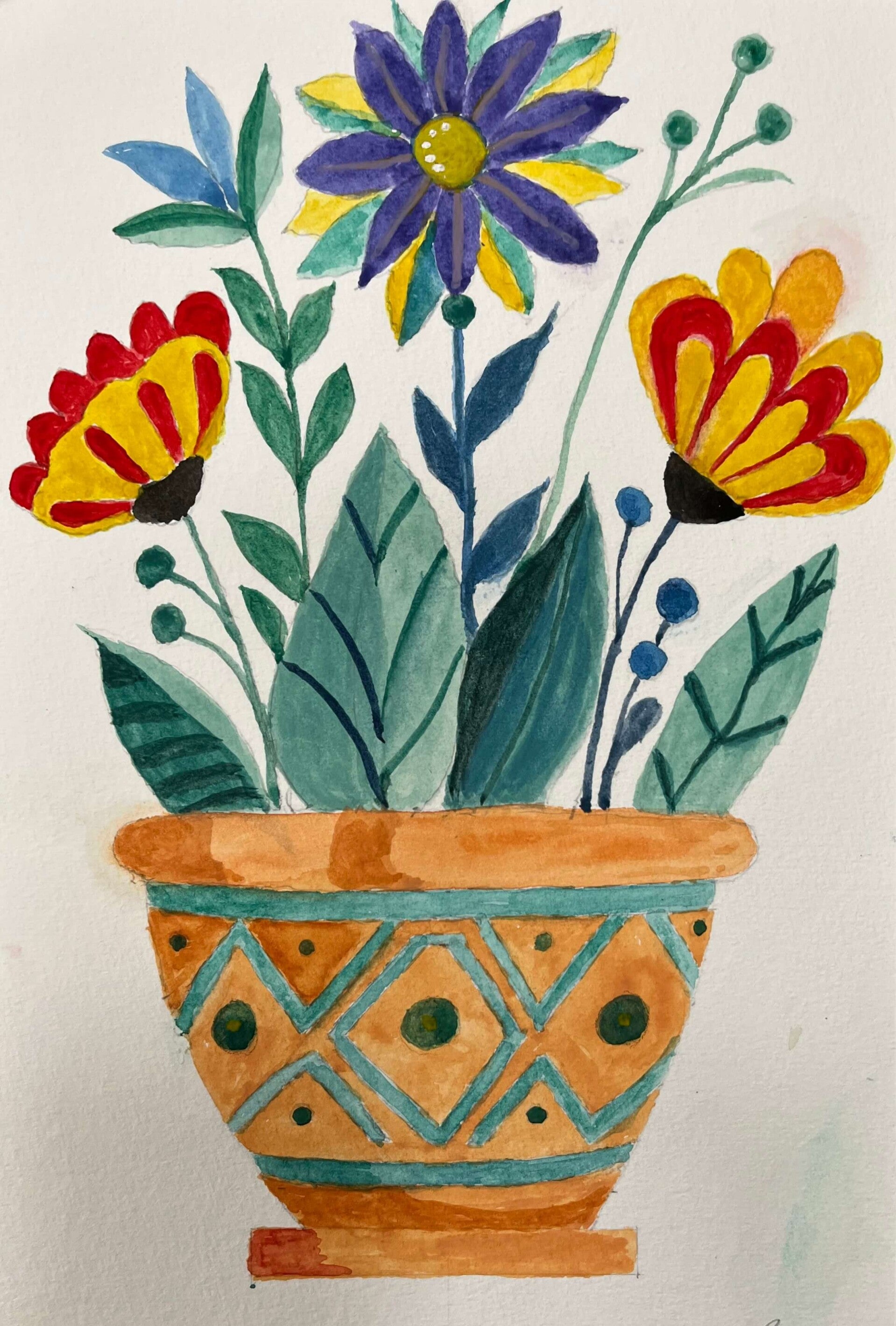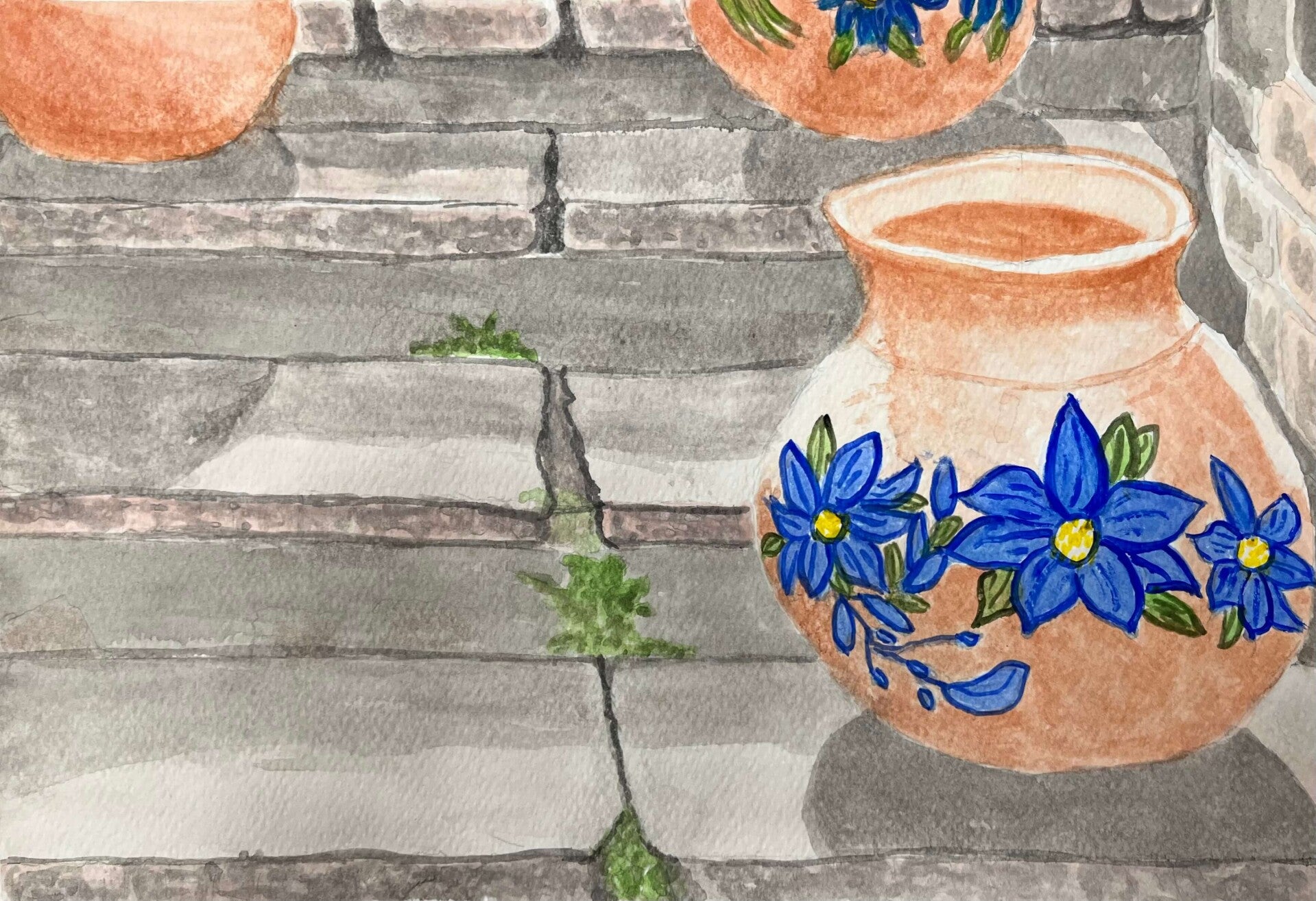 This week we are painting with both watercolour and gouache. Some opted for the transparent, fluid nature of watercolours, whereas others preferred the bolder, more opaque finish of gouache. From traditional terracotta to vibrant colours and intricate designs we have a beautiful collection of Mediterranean pottery.