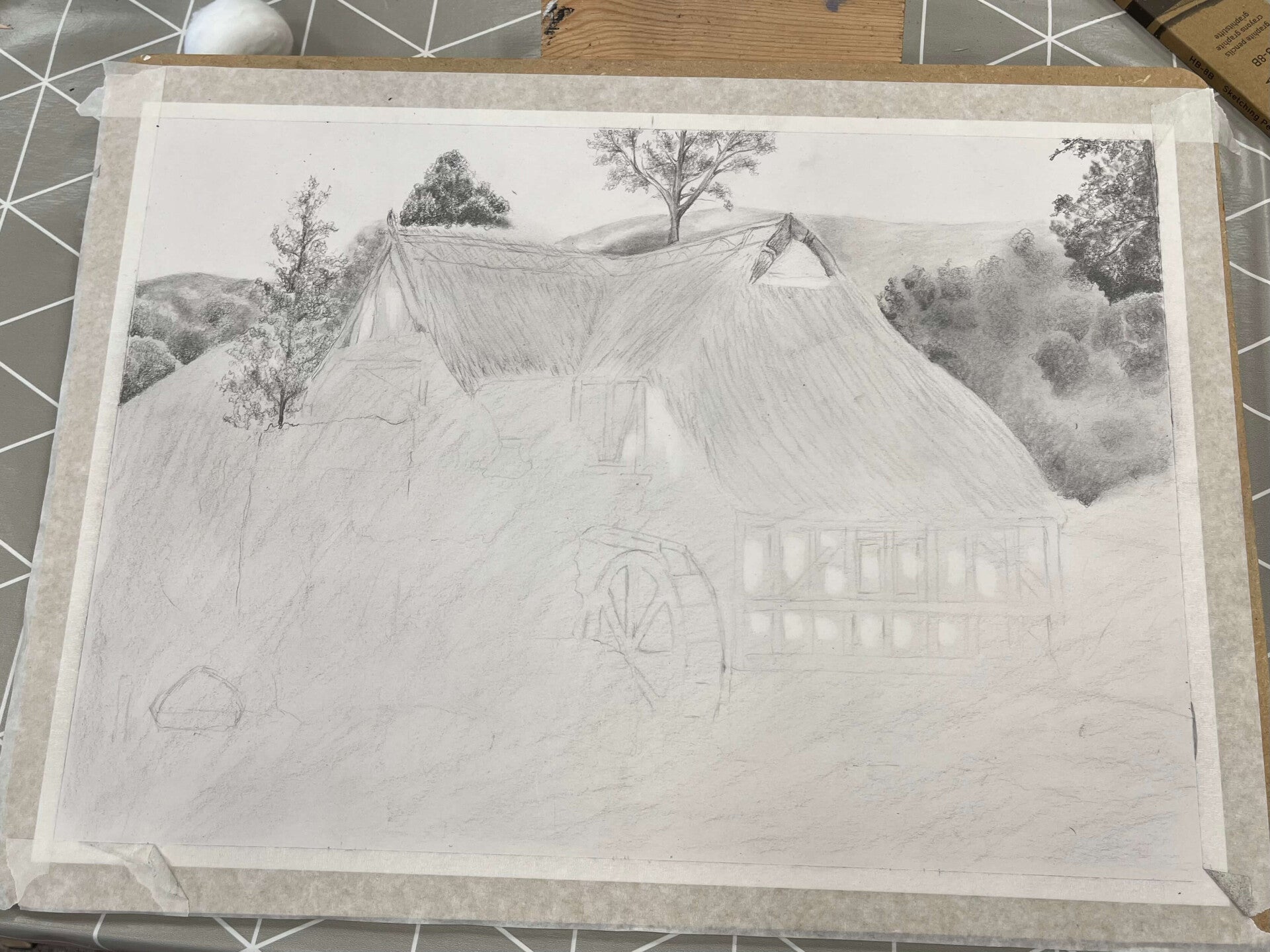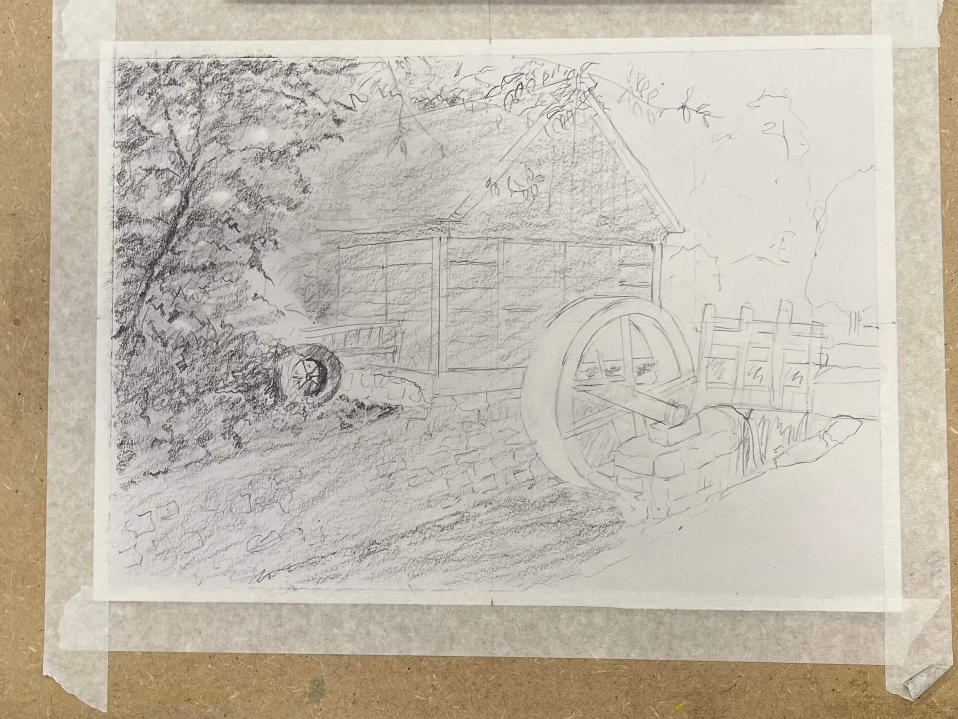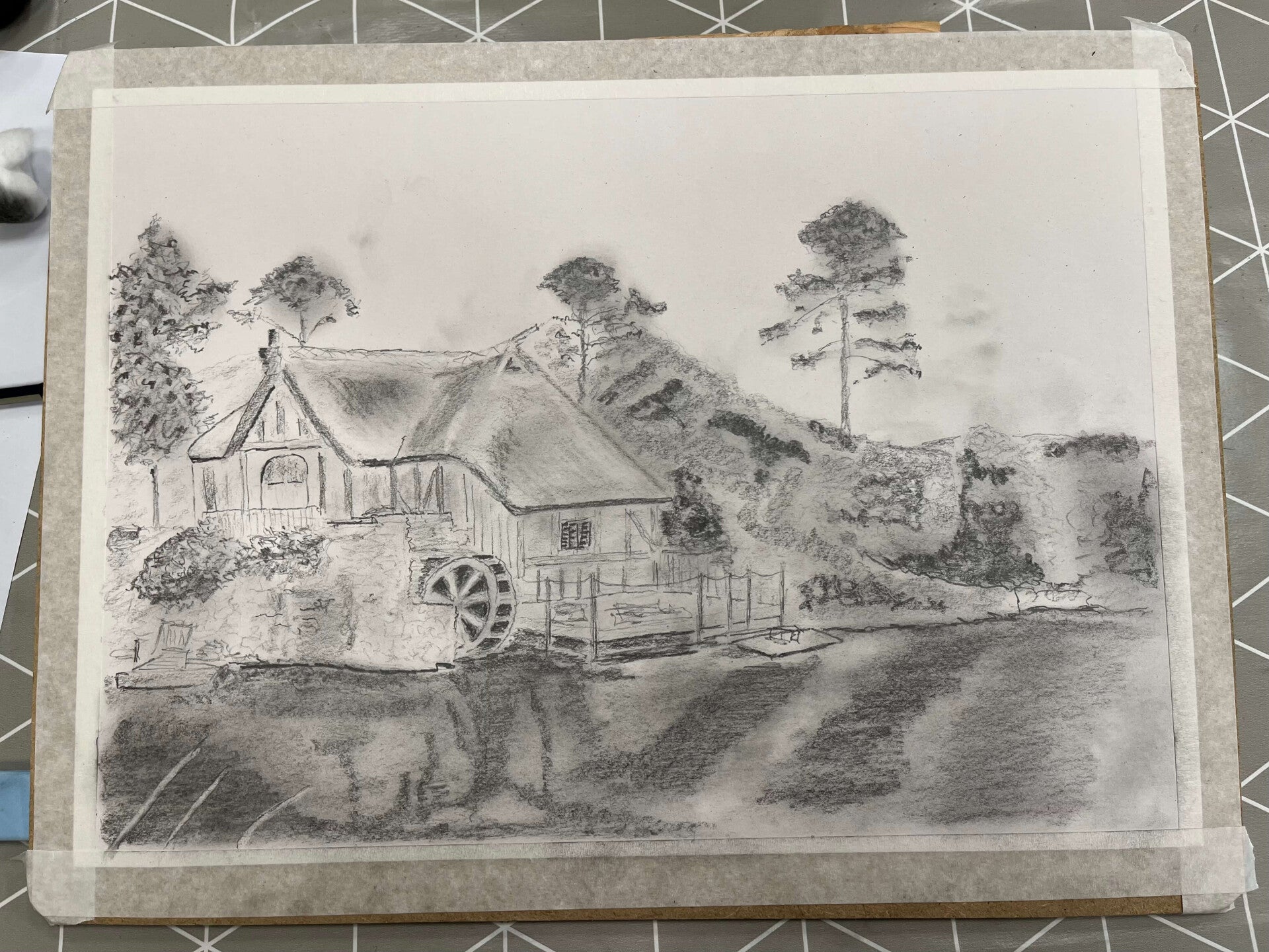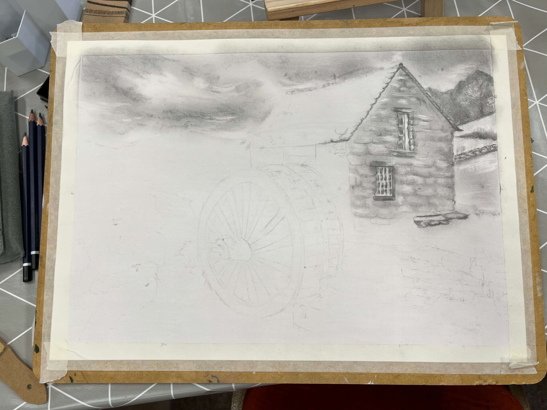 The wheels are in motion for our second week of drawing. Using graphite pencils, rubbers, cotton wool, and blending stumps, we’re building tones and textures to bring out the character of a charming olde watermill.