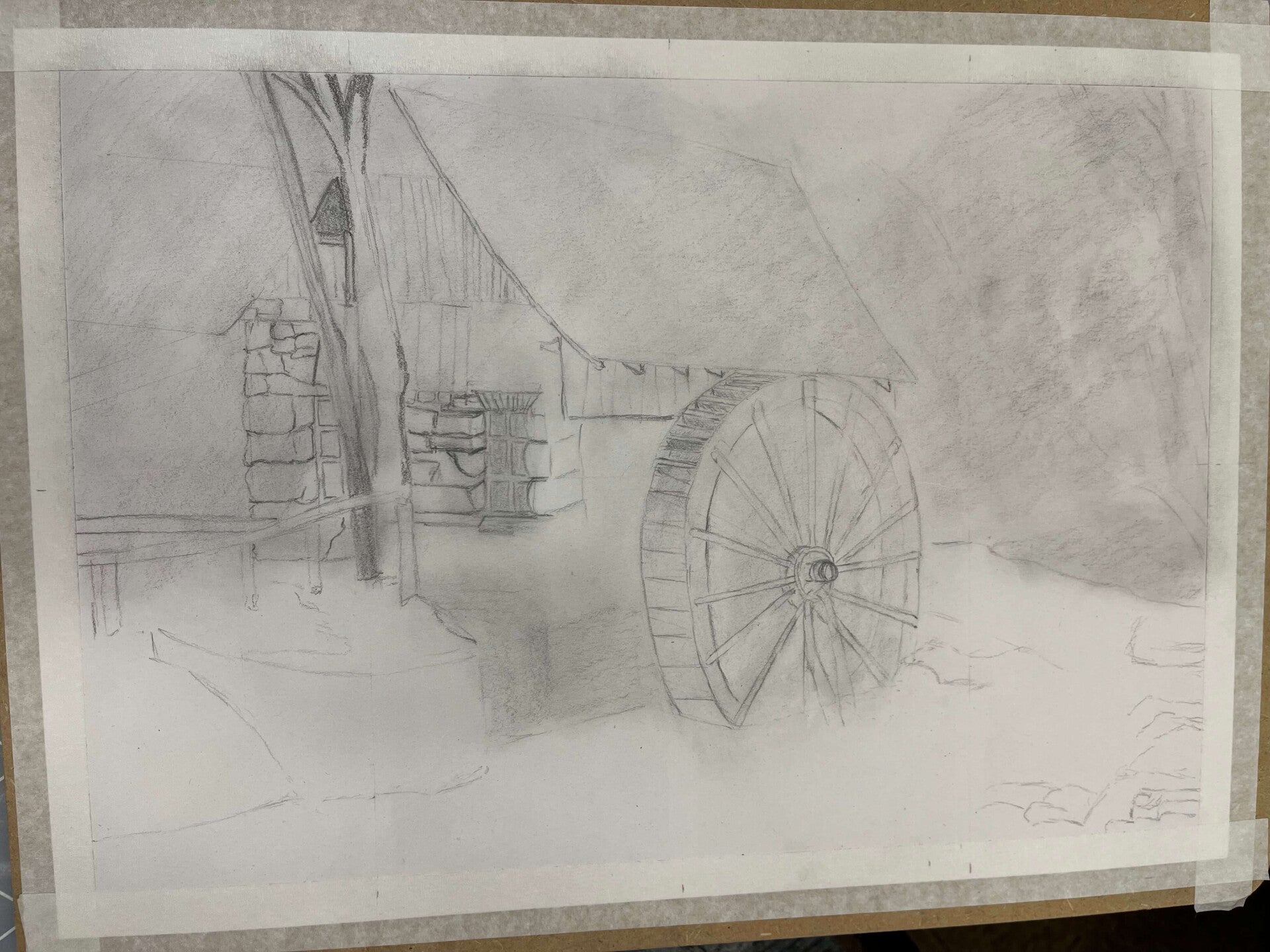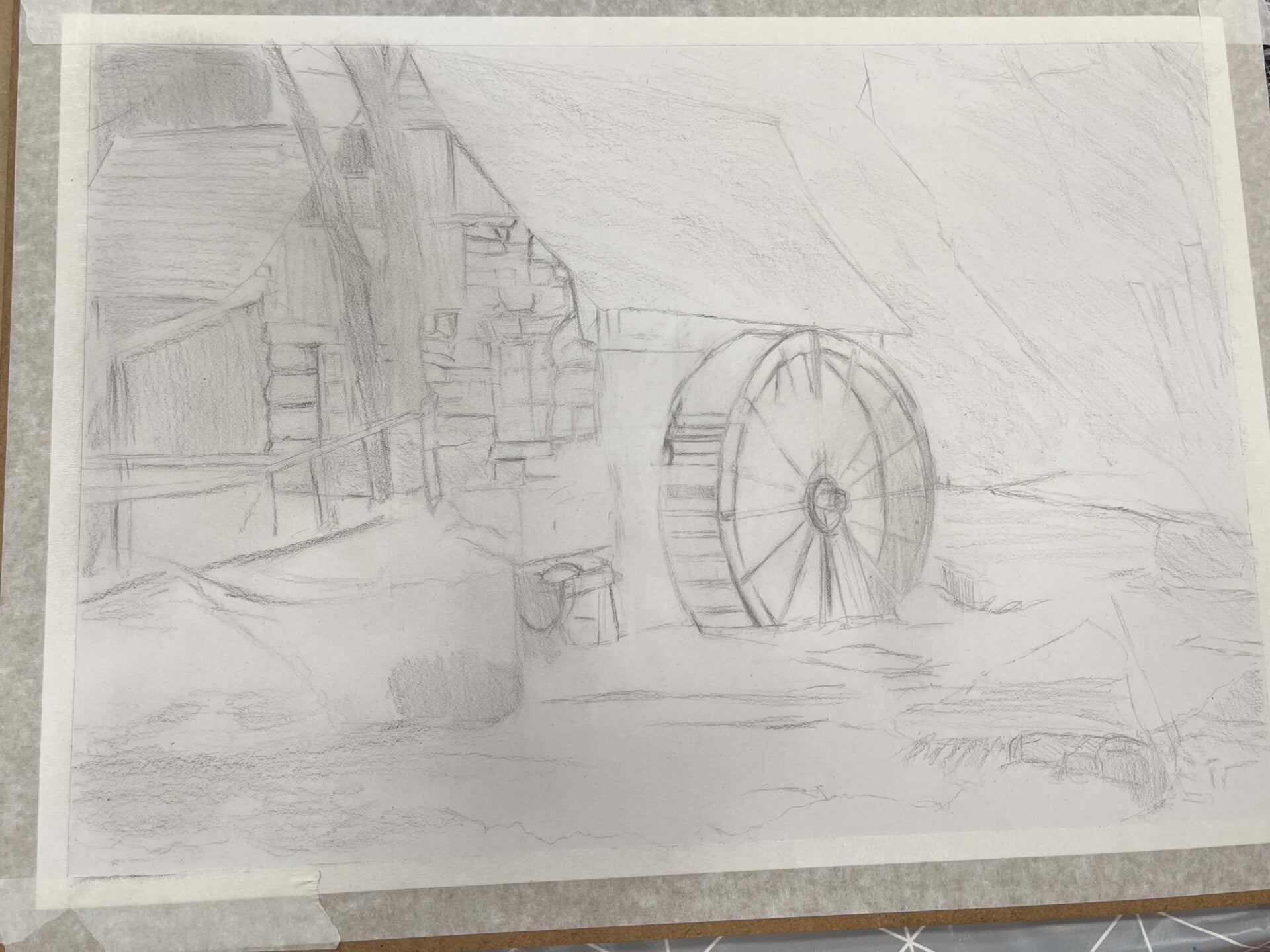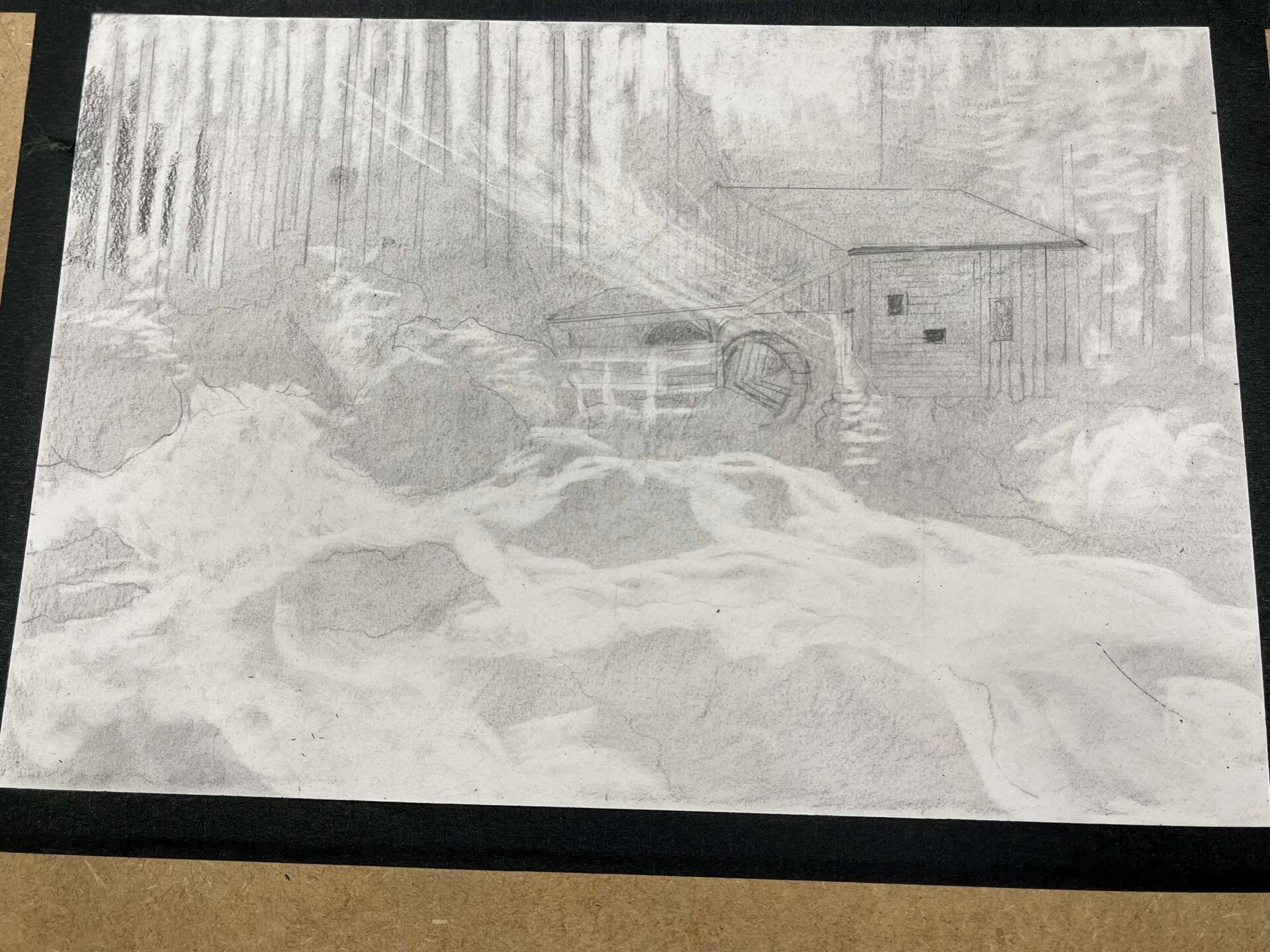 The wheels are in motion for our second week of drawing. Using graphite pencils, rubbers, cotton wool, and blending stumps, we’re building tones and textures to bring out the character of a charming olde watermill.