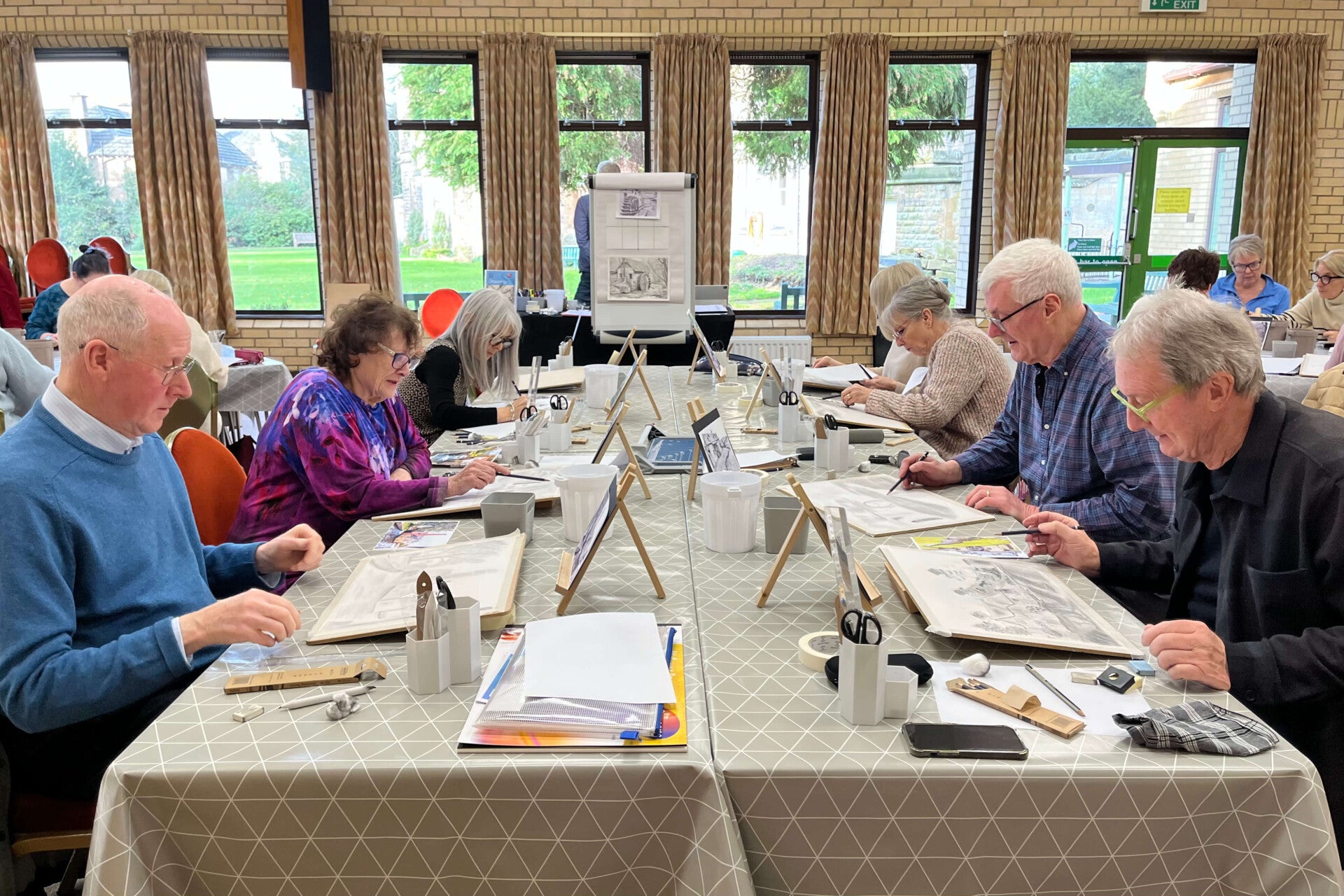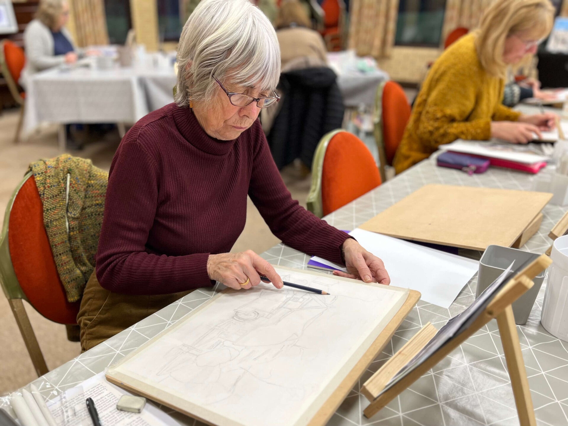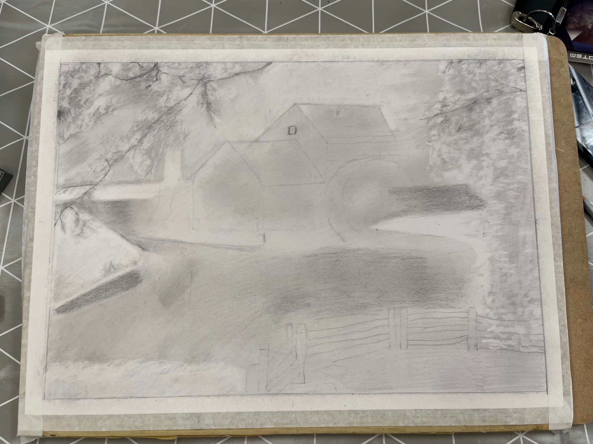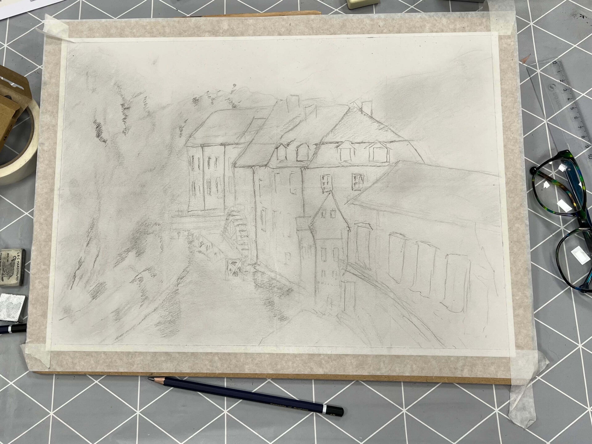 The wheels are in motion for our second week of drawing. Using graphite pencils, rubbers, cotton wool, and blending stumps, we’re building tones and textures to bring out the character of a charming olde watermill.