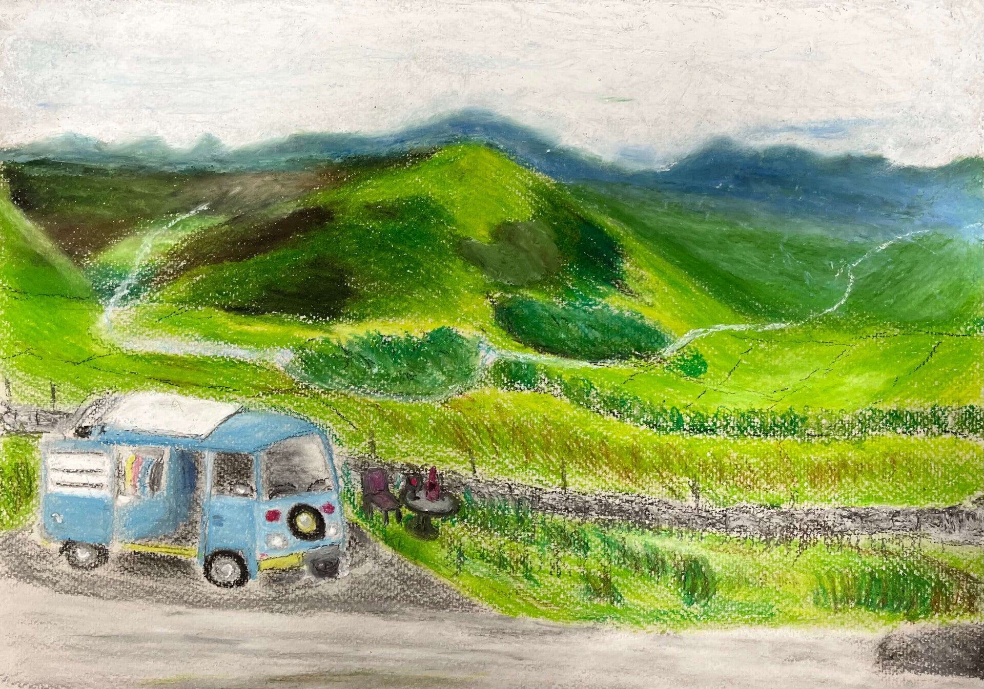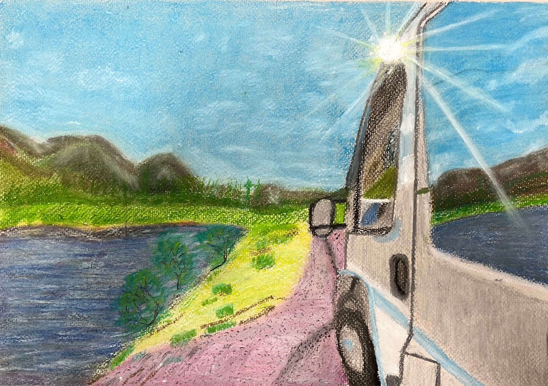 Oil pastels at the ready! With three sessions of drawing behind us, we move forward onto oil pastels with “day trip” as our theme. From high speed trains to a bus by the sea, we’re exploring that lovely feeling of freedom, being on the move and going places.